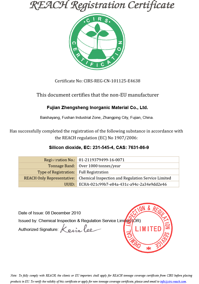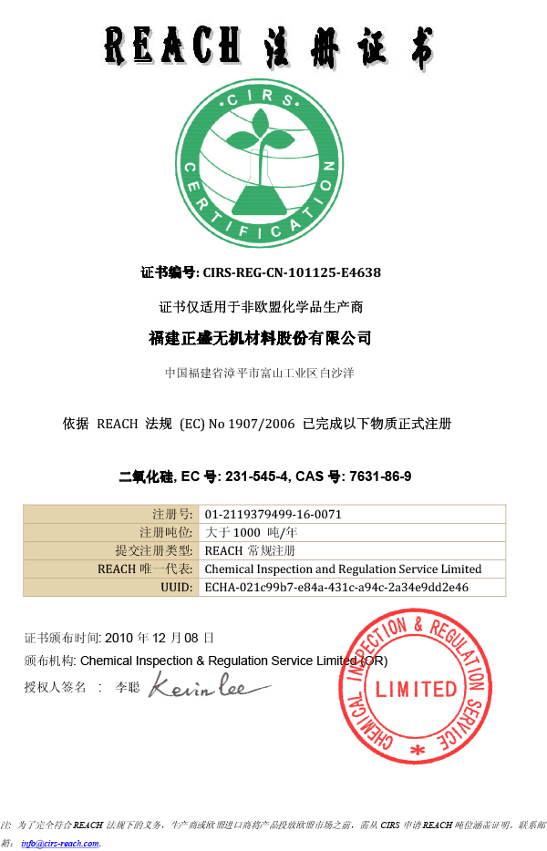 福建正盛-REACH-注冊證書